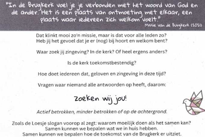 Deze kaart werd onlangs op ieder adres van de leden van de Brugkerk bezorgd. Ze gaat over het project ‘Brugkerkelijk Peil’ dat we graag in de komende maanden in onze gemeente willen uitrollen, op tal van manieren, onder andere door het houden van gezellige avonden en de ontmoeting met elkaar. Meer binnenkort meer via dit kerkblad, de website en de socials van de Brugkerk.